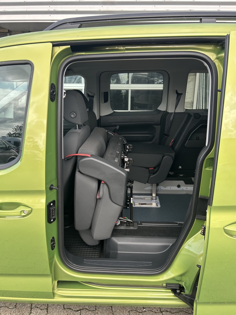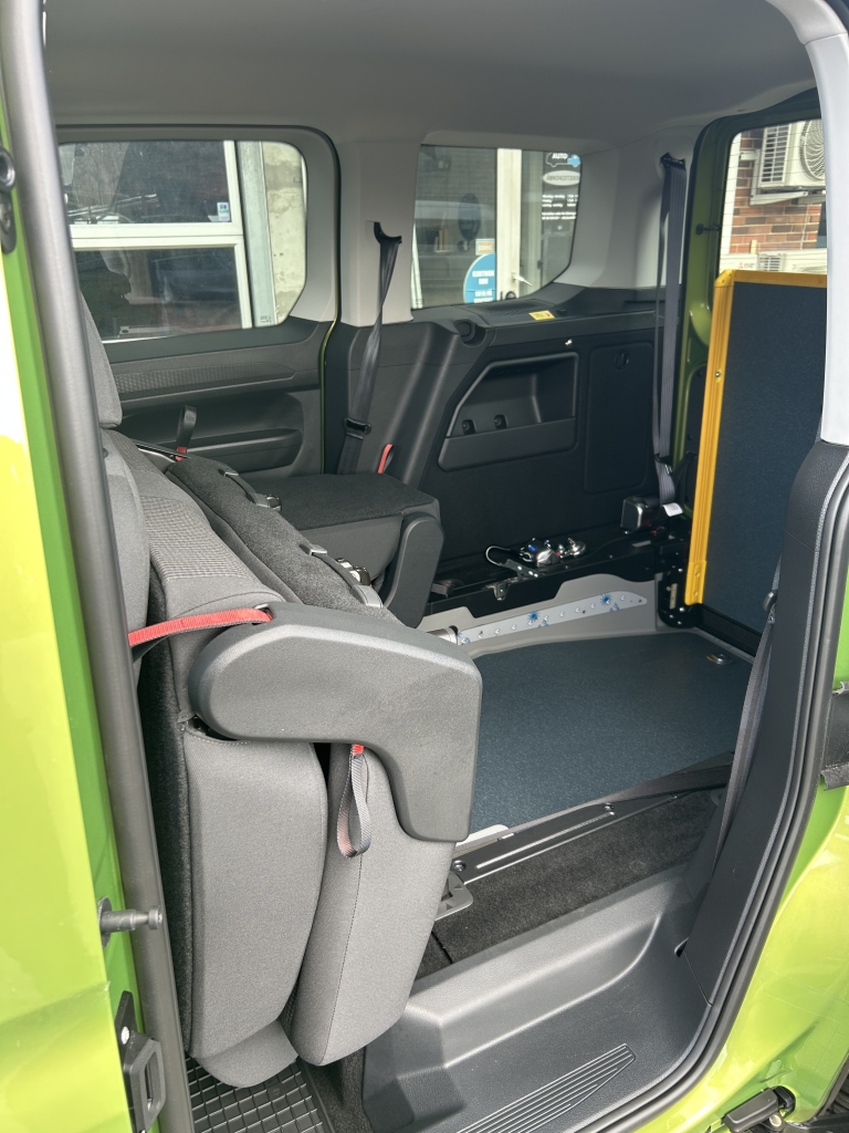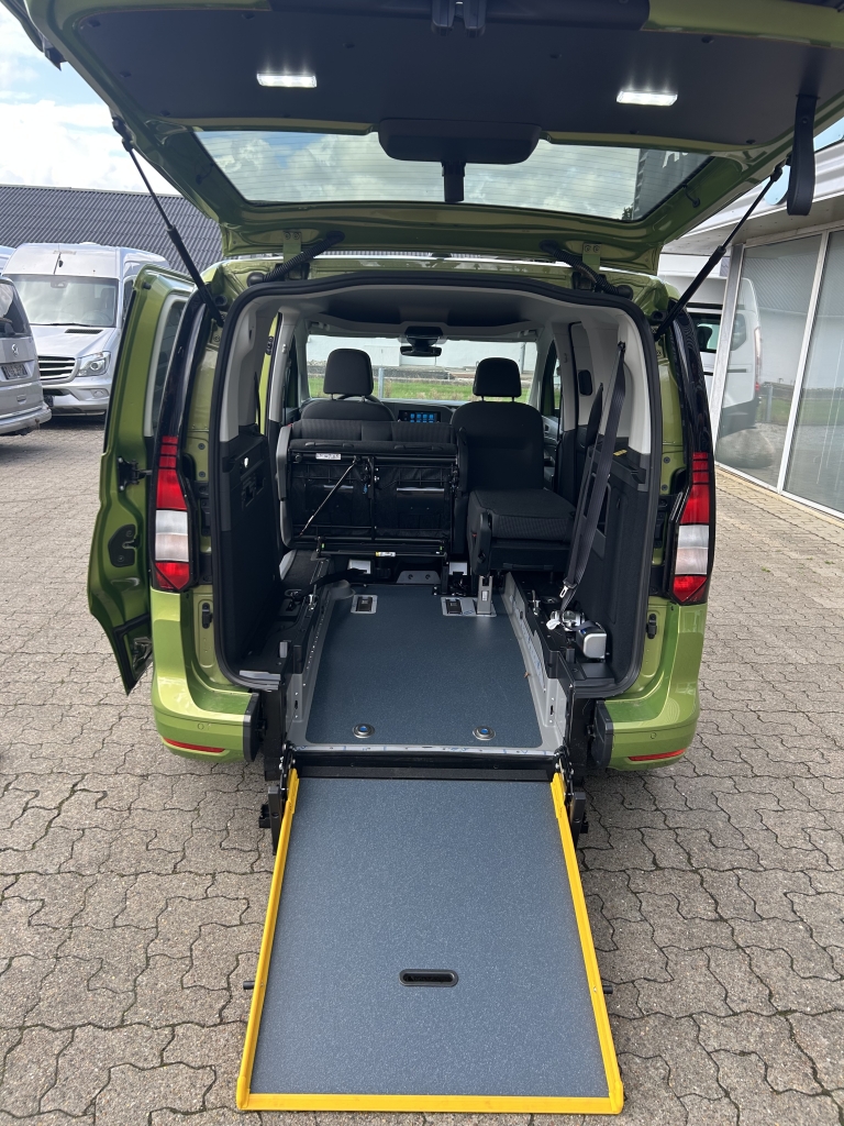 Med API Flexrampe løsning, kan du nemt og sikkert medtage en person, som sidder i kørestol, uden at du skal bruge hjælp til at få personen ind og ud af sæde. Du kører nemt og sikkert ind via rampe i manuel kørestol eller i el-kørestol. Fastspænder kørestolen og tager sikkerhedssele på. Bilen kan køre i parkeringshus og parkere på almindelig parkeringsplads. Hvis der ikke medtages person i kørestol, kan alle sæder i bilen benyttes til 5 personer.